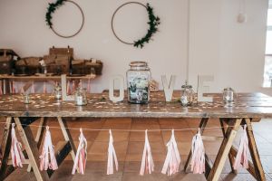 Idyllically situated down a hedgerowed lane, Dalduff Farm is an exclusive use venue bursting with rustic charm. The beauty of Dalduff is that it already contains all the elements one could wish for in order to create the perfect country wedding; however, for couples looking to inject their own unique style into their big day, this venue has the ability to propel creative types into diy wedding decor heaven. The owners have invested in wondrous furnishings and props to compliment and enhance almost every wedding style, from rustic wooden tables and benches to an ancient oak welsh dresser and a ginormous vintage mirror. On top of that, all crockery, cutlery, napkins, glassware, a PA system, staff (including your own wedding planner) are all available for couples to utilise.