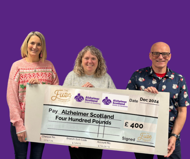 Pictured below: Emma Russell, Stakeholder Engagement Coordinator (middle) from Alzheimer Scotland receives the Fuze Foundation Q3 give back cheque from George (right) and Morag (left)