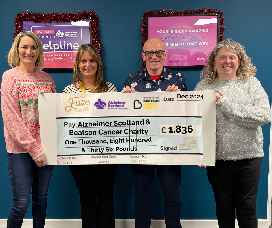Morag Webster, Chair of The Fuze Foundation and George McLean, Fuze Brand Ambassador met with representatives from both our charity partners and revealed their individual give back amounts for quarter 2 as £1,436 for Beatson Cancer Charity and £400 for Alzheimer Scotland.