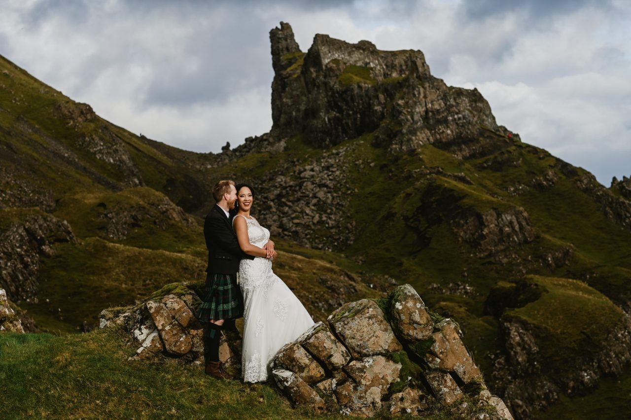 When we arrived at the car park, Andrew advised us that the perfect spot was just a wee walk away … so off we set, Briawna and Roland tentatively following our intrepid photographer as he strode off up the hill. Peter and I followed, slipping and sliding in the bog, table, marriage schedule, pens, blotting pad in hand. Peter said “What a stunning place to have a ceremony, forging marriage vows against a backdrop like the Quiraing, a landscape that’s been sculpted by time into something so beautiful. If you’re married out here with this mix of weather, you’re made of strong stuff, built to last!”