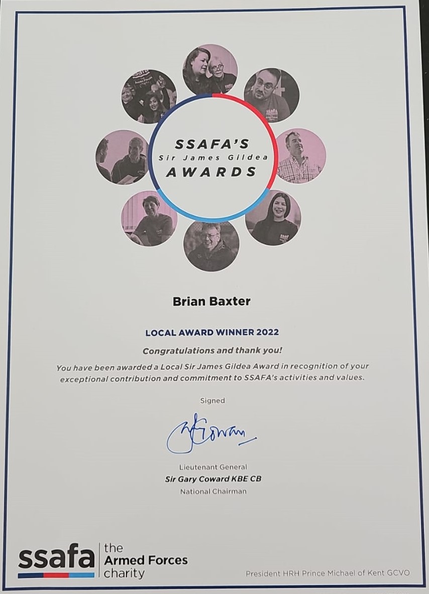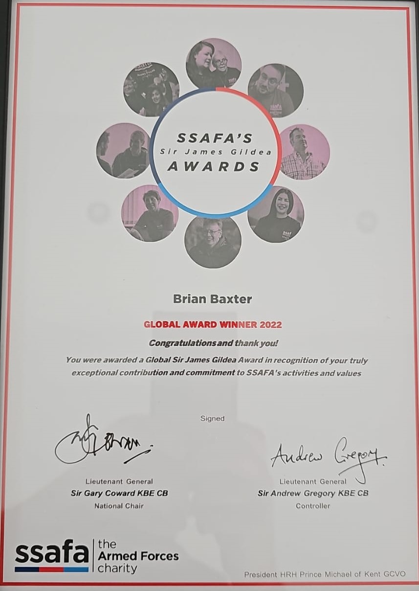 Brian has calculated he has raised over £100,000 across his time with the SSAFA, an incredible achievement. In April, he was presented with a Sir James Gildea Award – named after the founder of SSAFA – which are given to recognise volunteers for their exceptional contribution and commitment to SSAFA’s activities and values.