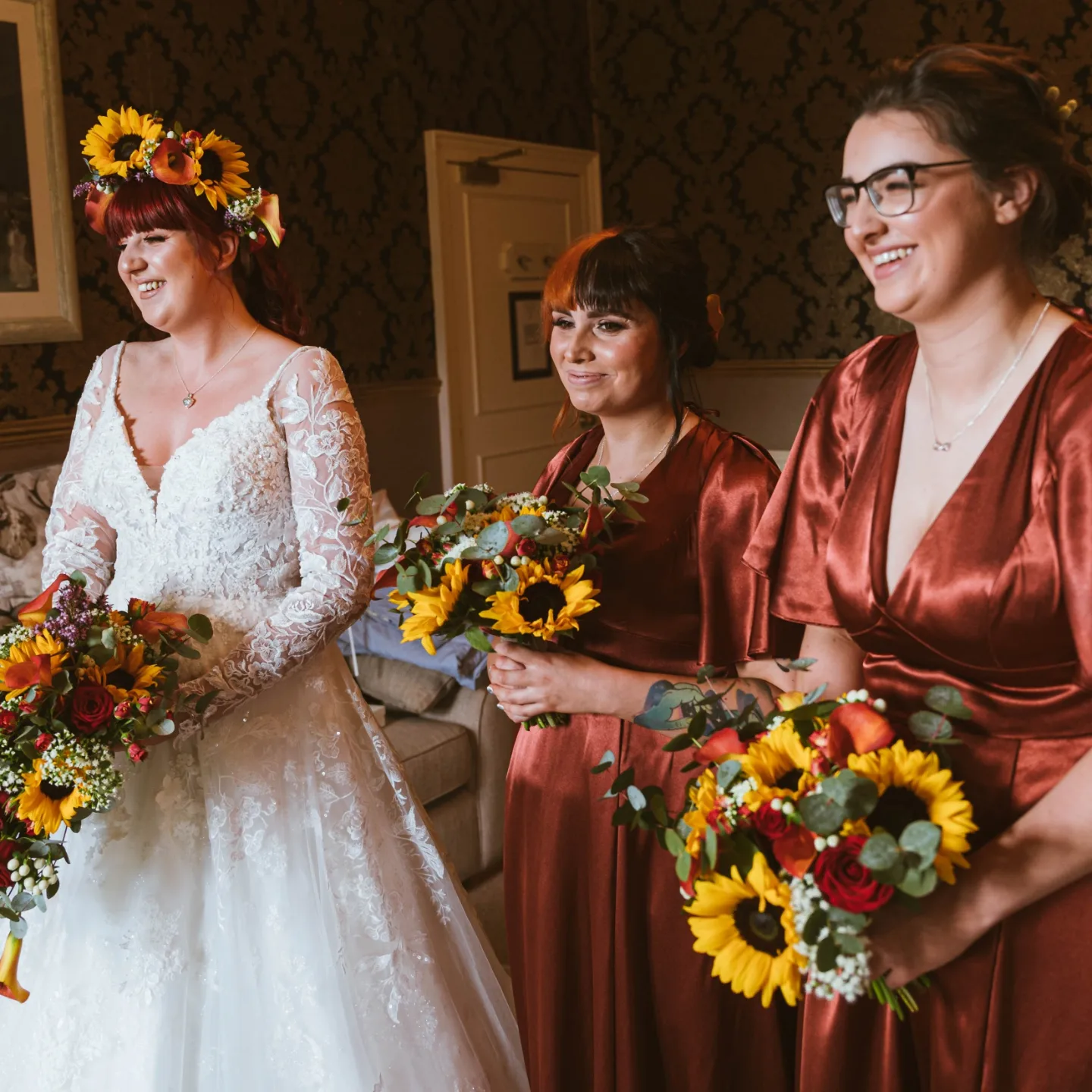 My dress was originally sleeveless, but the bridal boutique and fabulous seamstress worked with me to create sleeves using appliques and materials sent alongside the dress. I had two amazing bridesmaids, and knew I wanted them to wear burnt orange. I wanted them to be comfortable, so let them choose their style. We had no success finding burnt orange dresses everybody liked online, so we travelled to David’s Bridal and found the dresses almost instantly.