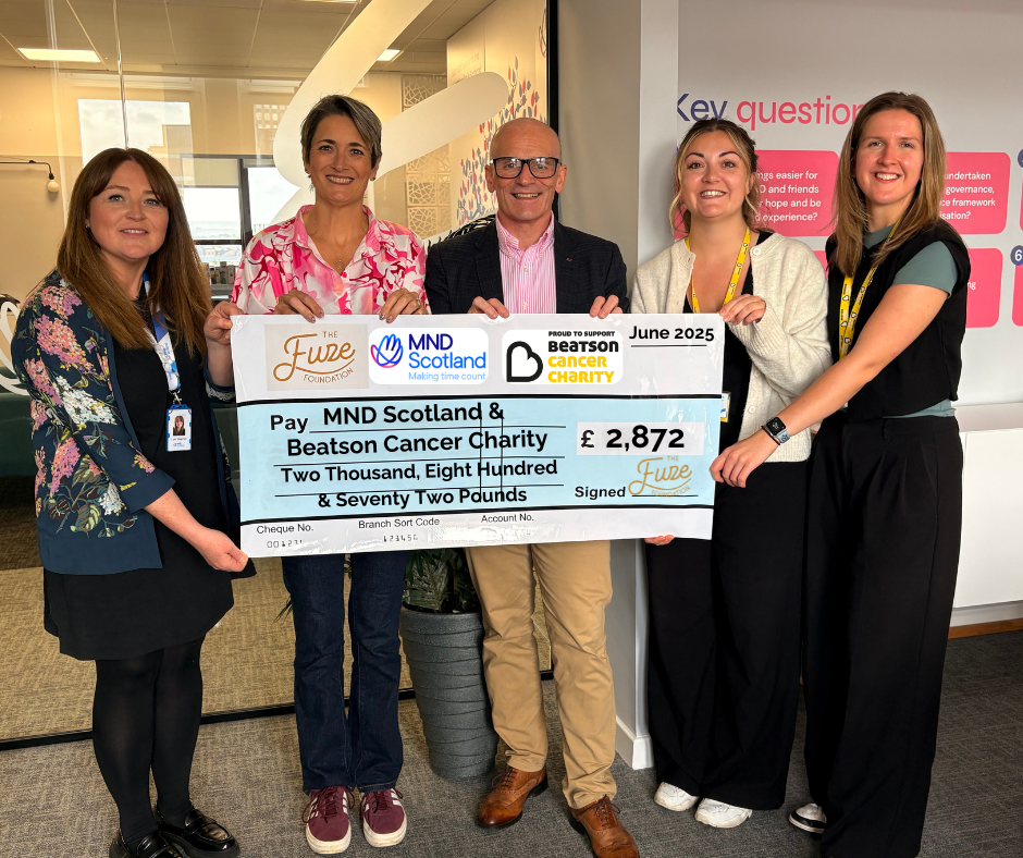Pictured above (left to right): Lynne Wiseman, Regional Fundraising Lead from MND Scotland Charity; Morag Webster, Fuze Foundation Chair; George McLean, Fuze Brand Ambassador; Heilidh Wilson and Lauren McGregor, Corporate Fundraisers from Beatson Cancer Charity.