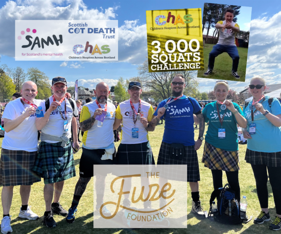 Couples who choose to be married by Fuze are supporting this ongoing work as a portion of their fee is donated to our good causes. In addition some of our celebrant team have been fundraising by taking on the Glasgow Kilt Walk and 3000 Squats in April challenge.