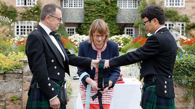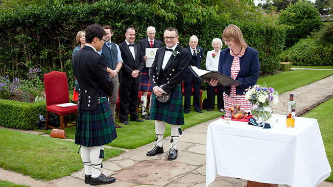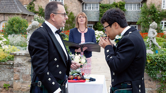 The big day had arrived! We both woke up and had to pinch ourselves that this was our day after all the work and build up. It was then all a bit of a blur trying to get the final things sorted like going to get our hair cut and finalising the speech. Despite it being overcast we made the decision to proceed with an outside wedding, as the forecast was that it wasn’t due to rain until later in the day. Mo sent some reassuring messages, as John was getting particularly nervous – she drew on her own recent experience about the importance of enjoying the day and having fun. Well the fun really started when our two groomsmen Derek and Yung joined us in our room for all of us to put our kilts on – we had so many laughs trying to work out where all the different elements of the highland dress went, as none of us had ever worn a kilt before. Roslyn, our photographer, came up to take some pictures of the process, which were great to look at after the event. We then met with Mo who demonstrated how the handfasting worked, as it was something that we wanted to make sure we got right. More calm and reassuring words from Mo and we were ready to roll slightly earlier than planned.