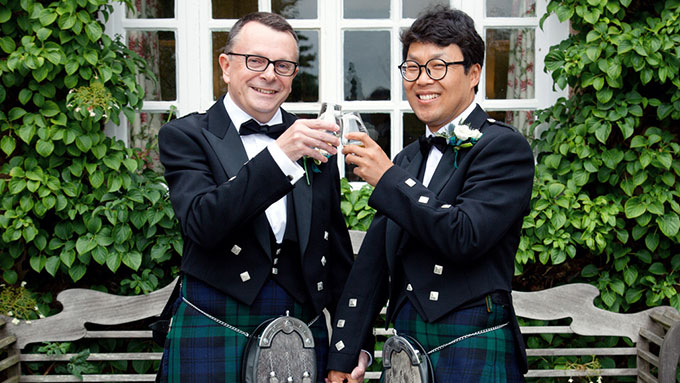 The ceremony itself was beautifully done by Mo and she had set up the table for the ceremony in such a lovely way, with flowers and also the traditional Korean marriage ducks. It is amazing how emotional weddings can be and John started to feel the effects, but Myoungil said some reassuring words. The whole ceremony worked beautifully, from the readings that we had to the handfasting and finishing off with drinking from the quaich. The latter provided some laughs for the guests as Myoungil quite clearly didn’t like the taste of the whisky being used in the quaich.