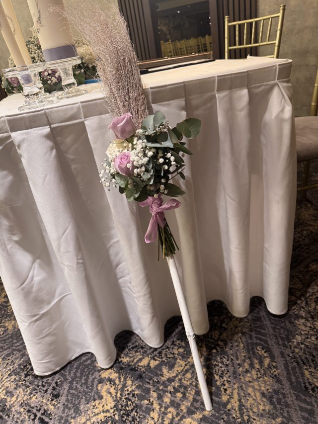 Well, did you know that in some culture’s, brooms are actually heirlooms? Who knew! Deep rooted into families, the same broom is often passed down generation to generation to use in their wedding ceremonies. But if you don’t have an heirloom to use, nowadays, the broom is unlikely to be something you have just lying around in your typical collection of household sweeping tools! The broom is usually around 3ft long, with a wooden handle and lots of natural bristles. So, time to hit those car boot sales or do a bit of online shopping! And, of course, would it even be a wedding broom if it wasn’t customised to suit the wedding?! Brides and grooms when using this gesture, add silk ribbons, flowers, beading or lace to their brooms. For Linda and Grant, they spray painted their broom white and added a bouquet of flowers, the colours of which, blended with the colours of their wedding perfectly – cream and purple.