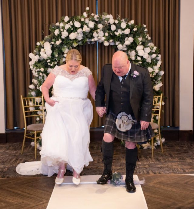 Linda and Grant chose to do it as the precursor to them walking back up the aisle so guests were all primed to ‘clap, cheer, whistle and make as much noise’ as they possibly could as I announced them, for the very first time, as ‘the new Mr & Mrs Middleton’! And they jumped to rapturous applause and lots of smiling faces – including their own! But of course, if you wanted to, you could get your guests involved by getting them to do a countdown before you jump and then conclude your ceremony afterwards.