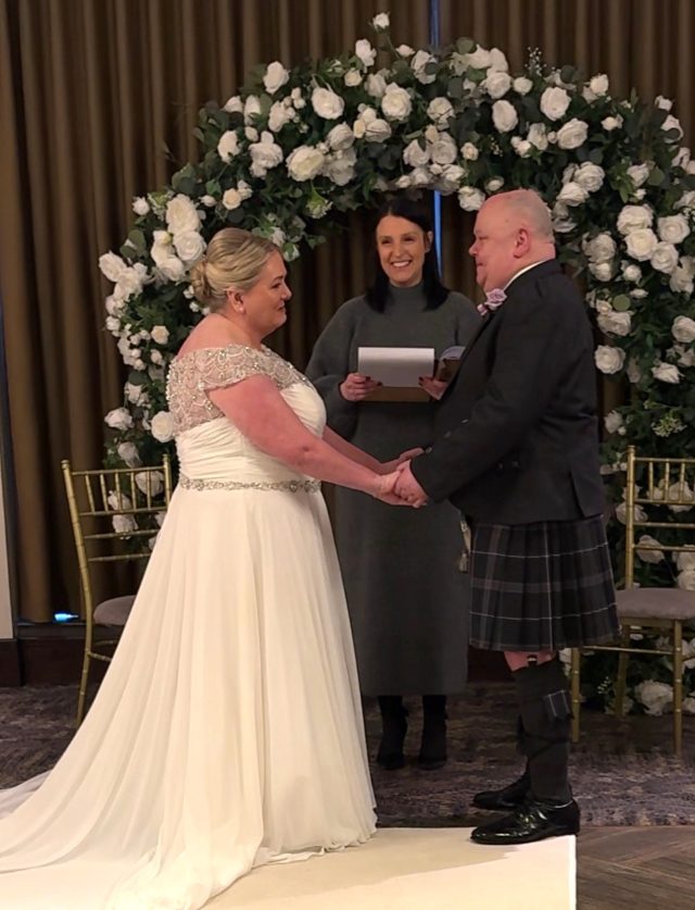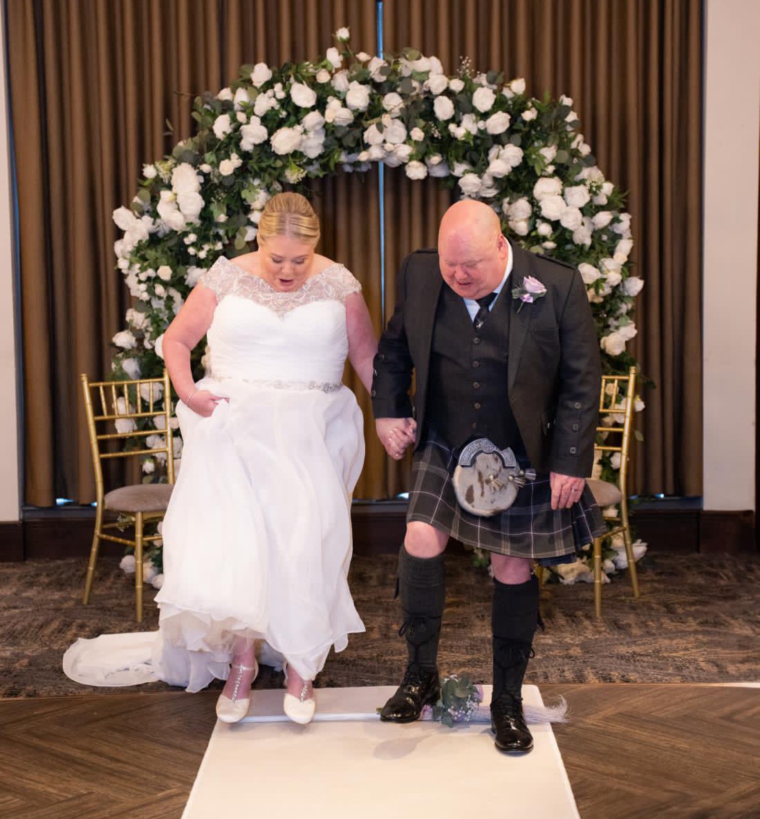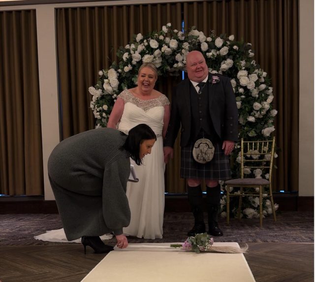 But regardless of how it originated, jumping the broom holds a beautiful place within a humanist wedding ceremony. So, when my couple, Linda, and Grant – the new Mr & Mrs Middleton, married on the 17th of February, this year, 2025, said they’d love to include it in their own wedding ceremony, I quite literally ‘jumped’ at the chance! As did they!