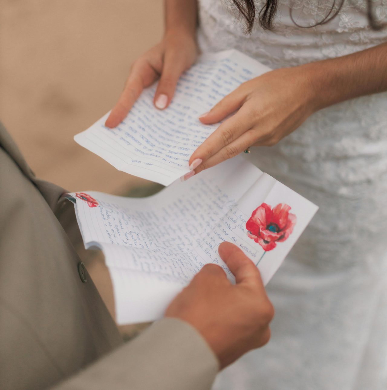 Many couples choose to keep their vows a surprise until the day, and it’s often one of the most moving parts of the ceremony. That said, if one of you is planning to write three lines and the other three pages, it’s worth agreeing a rough length ahead of time!