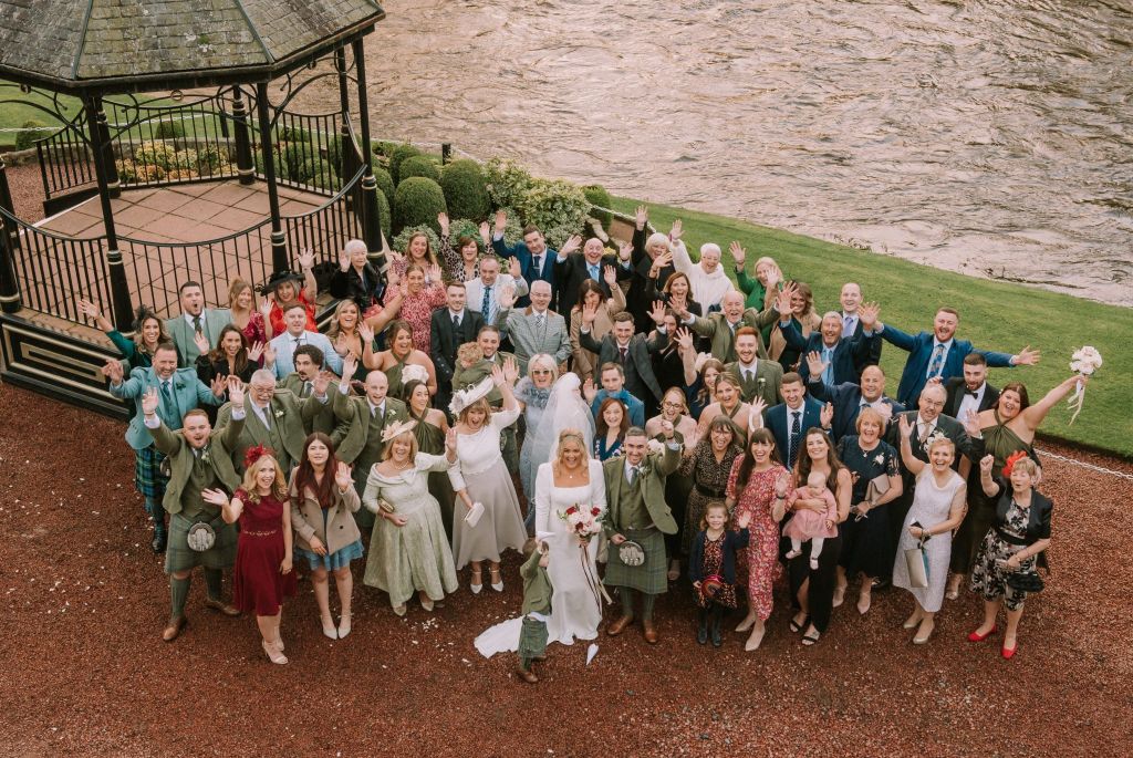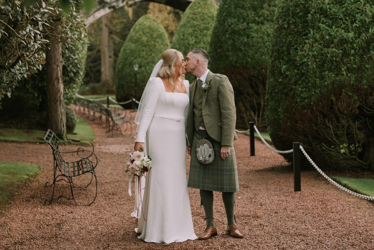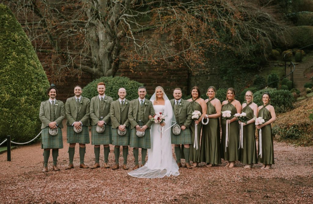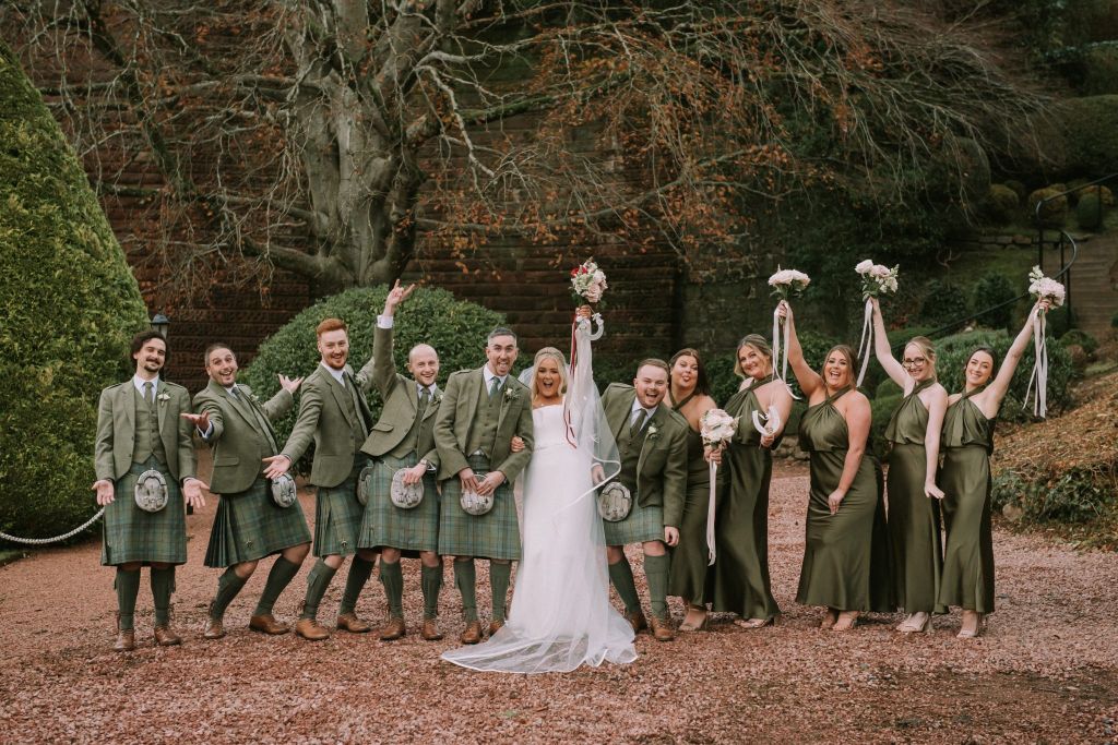 Like so many sayings and expressions, we can only make educated guesses at their origins. Using “dressed to the nines” in short means more or less “to perfection.” Now, Amanda and Antony pulled that off with their own stunning outfits, and so did their handsome and gorgeous bridal and groomsmen parties. The shades of green combination worked perfectly against the autumn backdrop gardens at their beautiful Ayrshire venue.