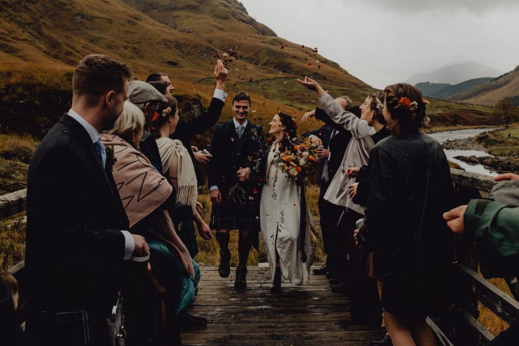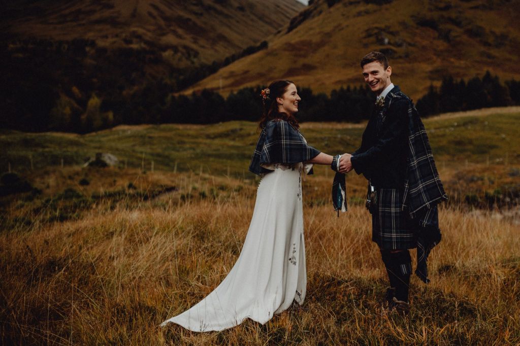 I then spot a familiar face in the form of Neil Thomas Douglas. Neil is an incredibly talented photographer whom I have had the pleasure of working with before and his photographic eye and photographs are remarkable. Neil does spend a lot of time photographing weddings in Glencoe and he knows the place like the back of his hand. “We should go for It now Douglas! The weather and light is in our favour”. Sam & Elena are in agreement also, so we set off to the ceremony location, complete with back up blankets and brolly’s just in case.
