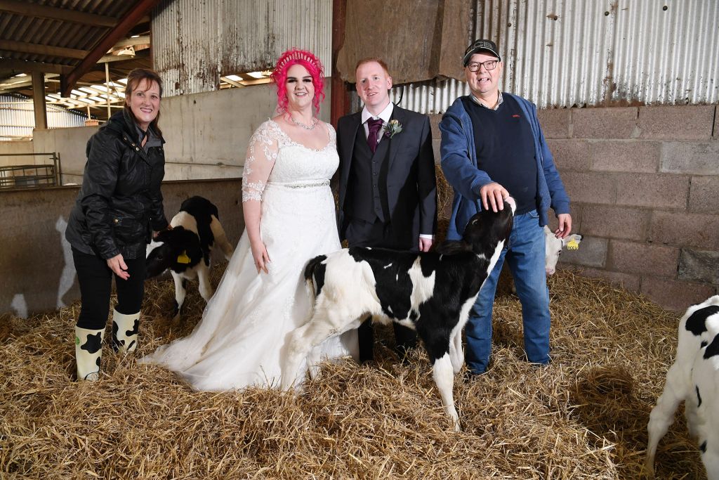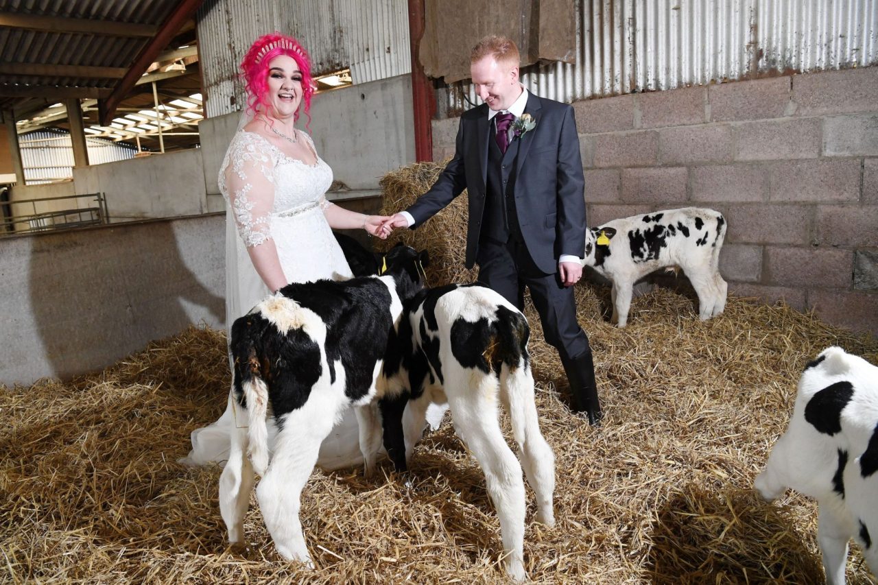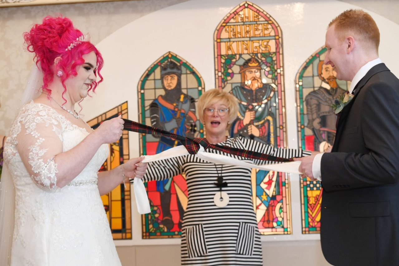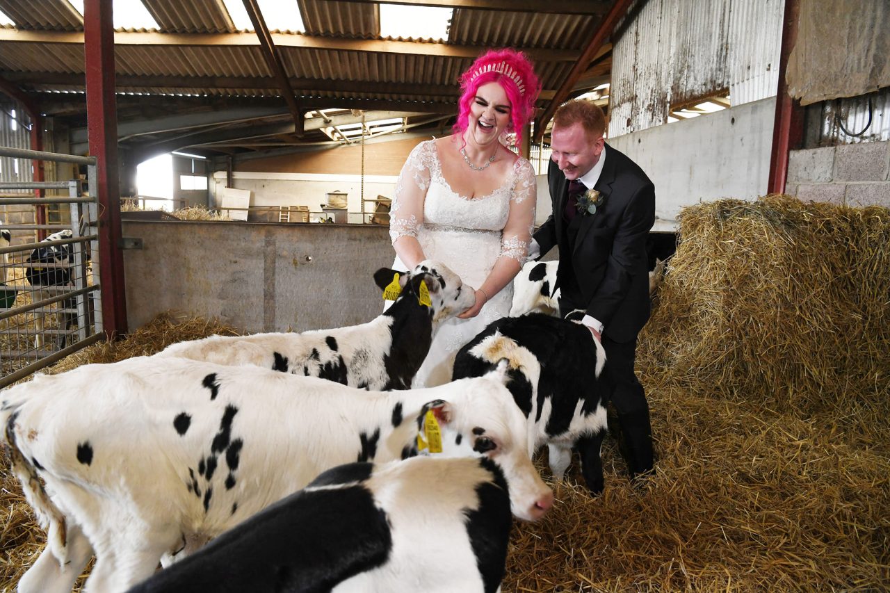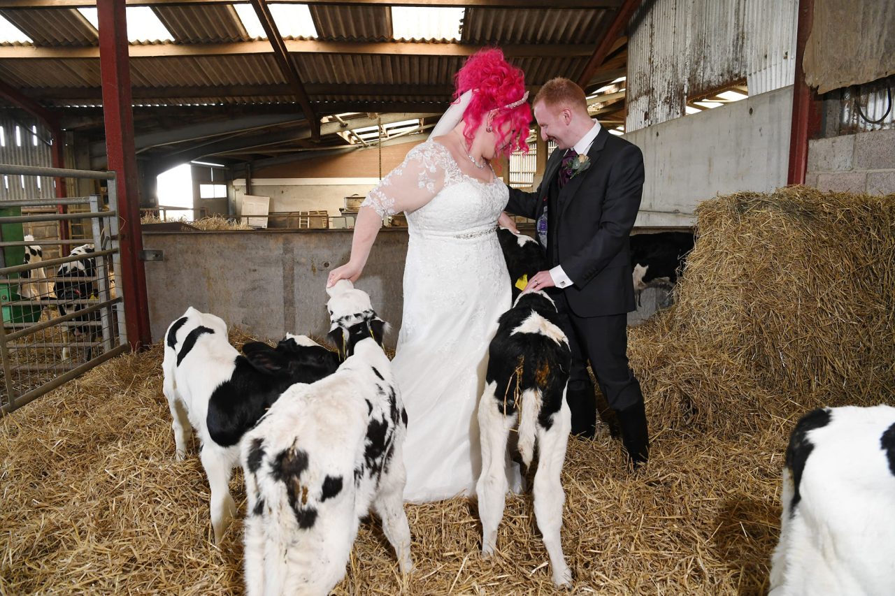 This humanist wedding ceremony had a bride with shocking pink hair, a song performed live by one of the bridesmaids, a remembrance candle lit, warming of the wedding rings, handfasting, drinking from the Quaich and the little matter of a photo shoot at a nearby farm with some cows!!!