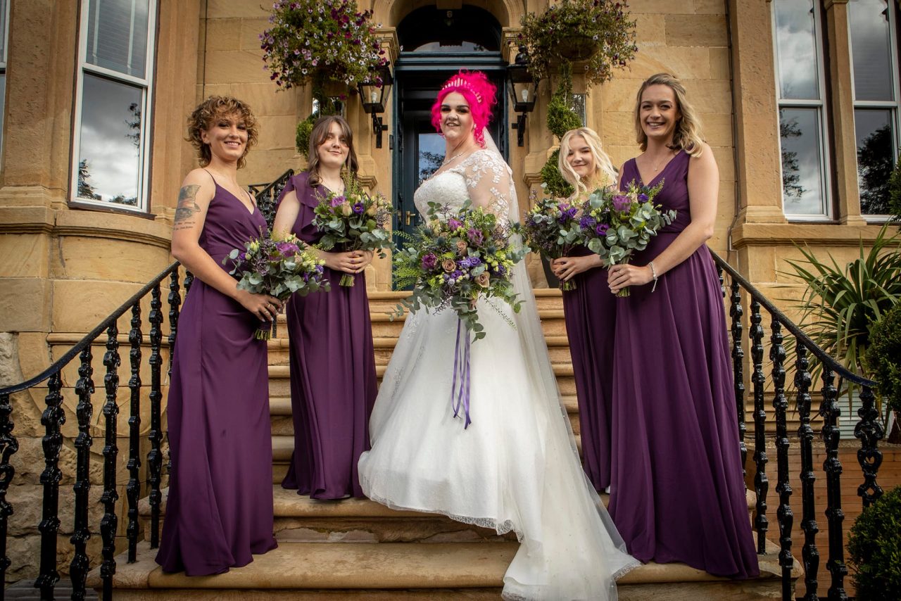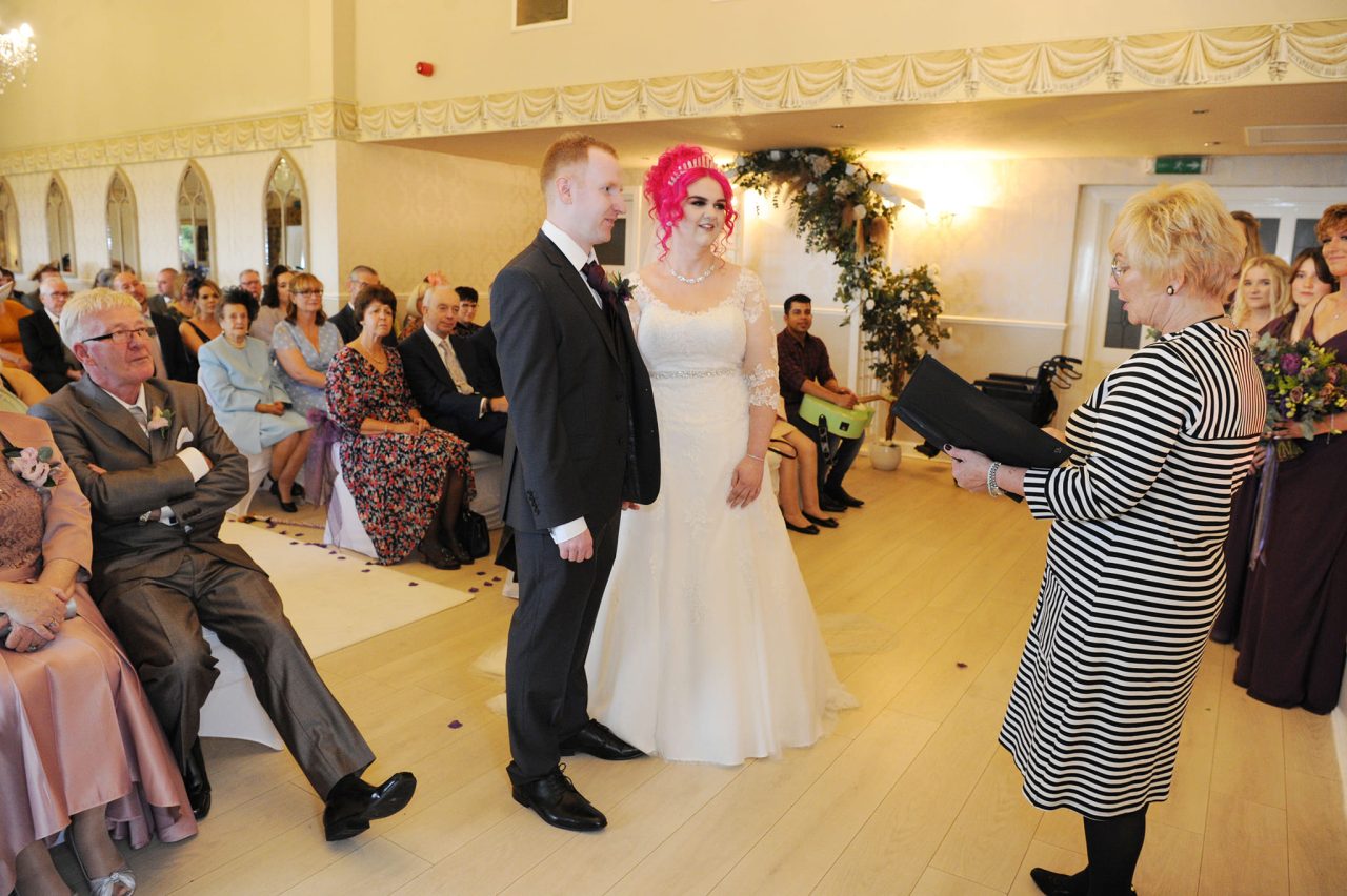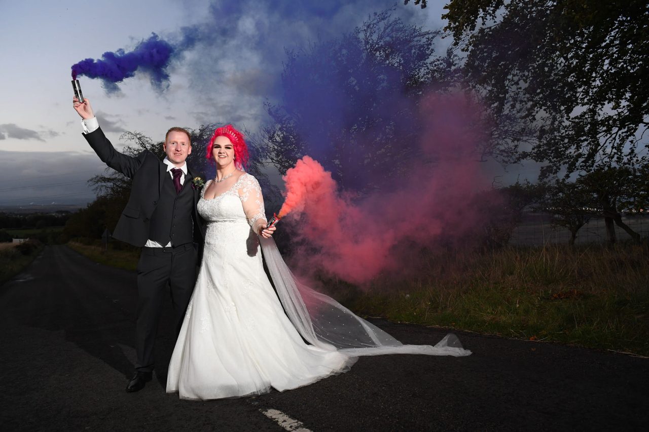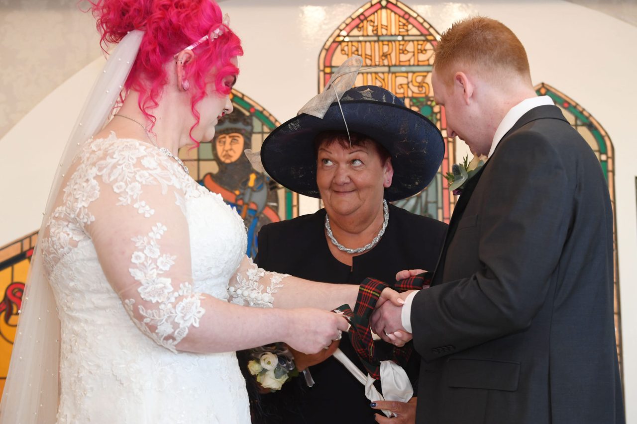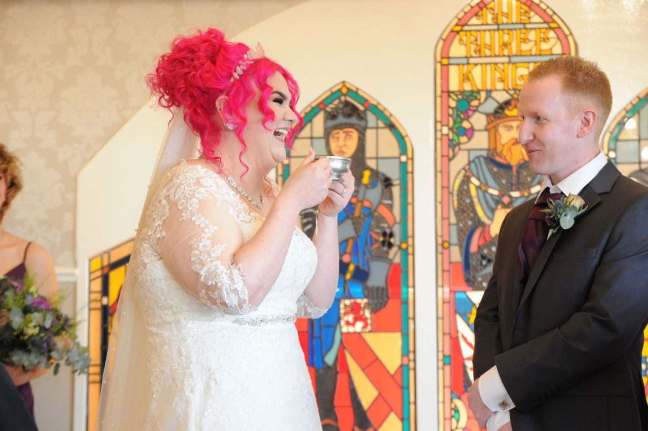 This humanist wedding ceremony had a bride with shocking pink hair, a song performed live by one of the bridesmaids, a remembrance candle lit, warming of the wedding rings, handfasting, drinking from the Quaich and the little matter of a photo shoot at a nearby farm with some cows!!!