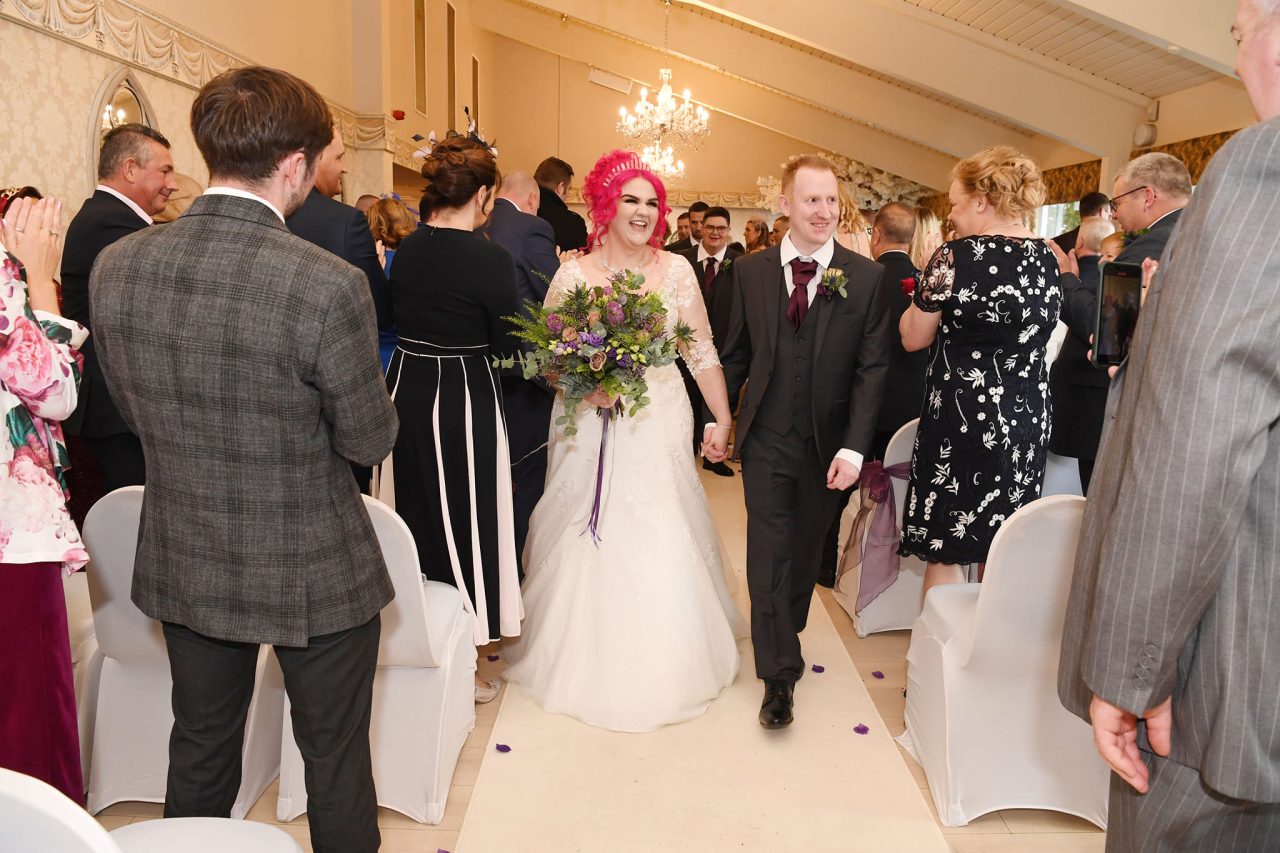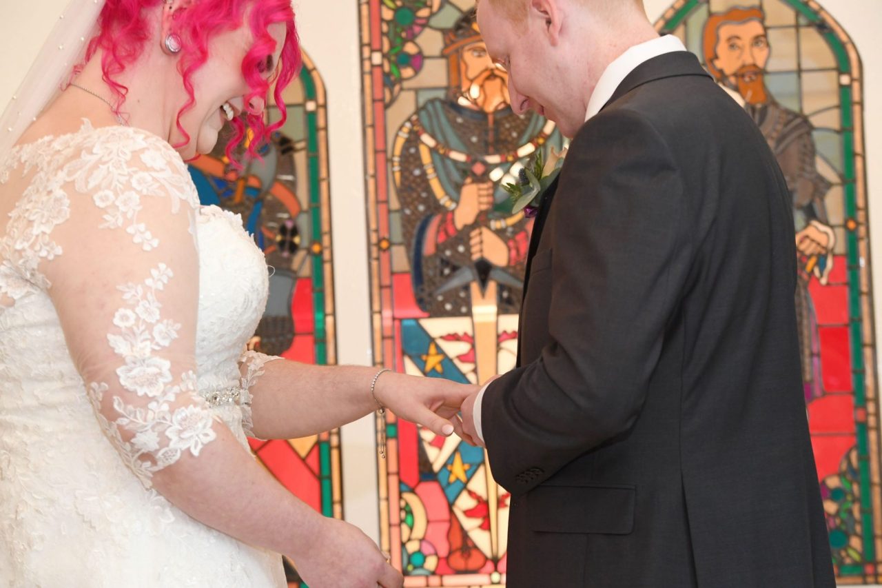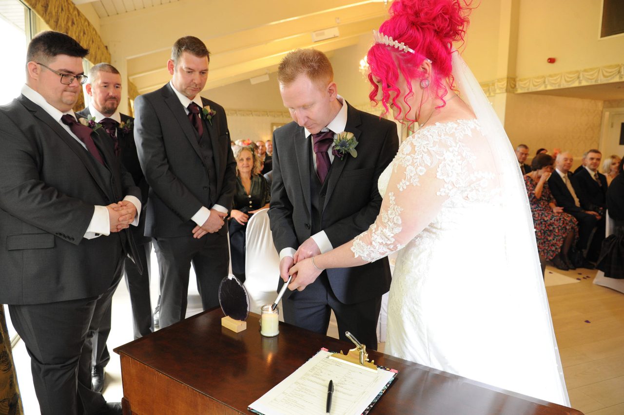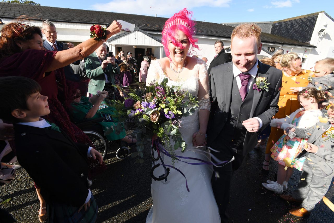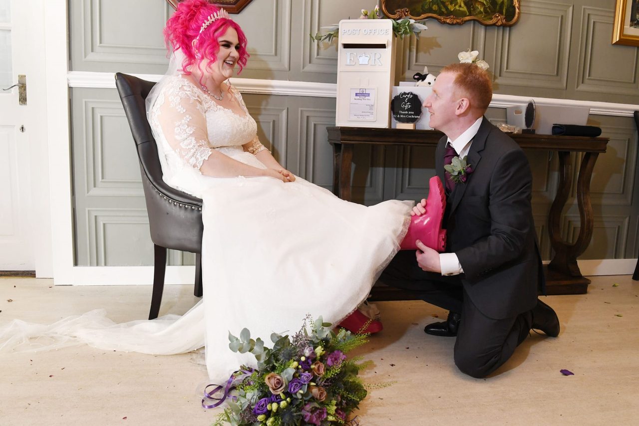 This humanist wedding ceremony had a bride with shocking pink hair, a song performed live by one of the bridesmaids, a remembrance candle lit, warming of the wedding rings, handfasting, drinking from the Quaich and the little matter of a photo shoot at a nearby farm with some cows!!!