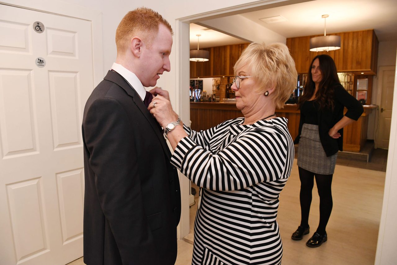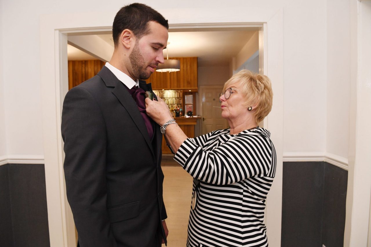 Christopher and Best Man Jamie get some expert adjustments before Fiona’s big aisle reveal