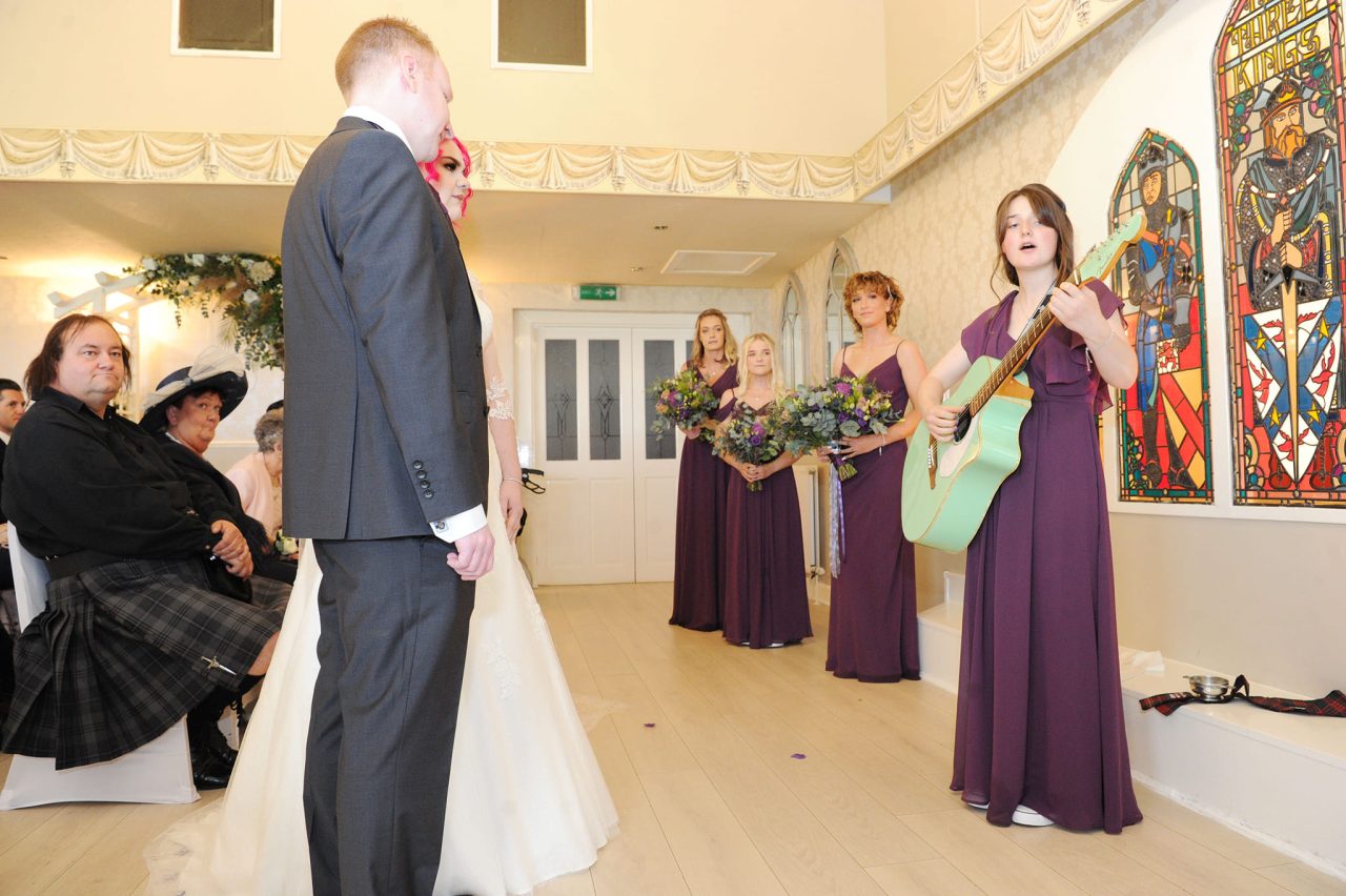 Above: Lighting a remembrance candle for absent loved ones – Bottom: Bridesmaid and niece Arellia sang a played during the ceremony