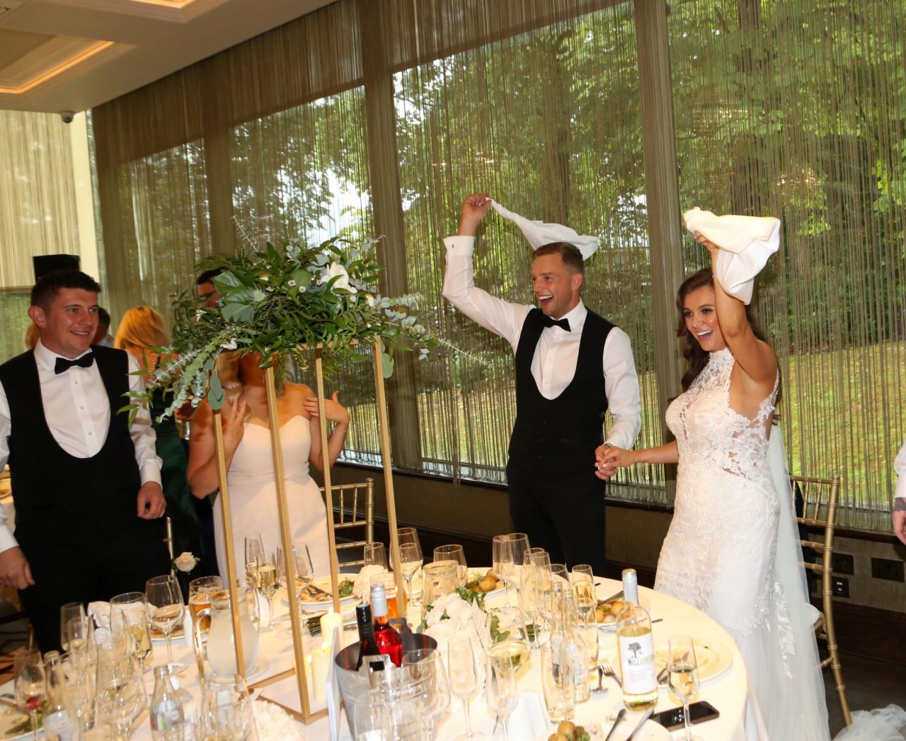Jen and Jim get into the party mood during their wedding breakfast, caught to perfect by Ryan Mimiec Photography