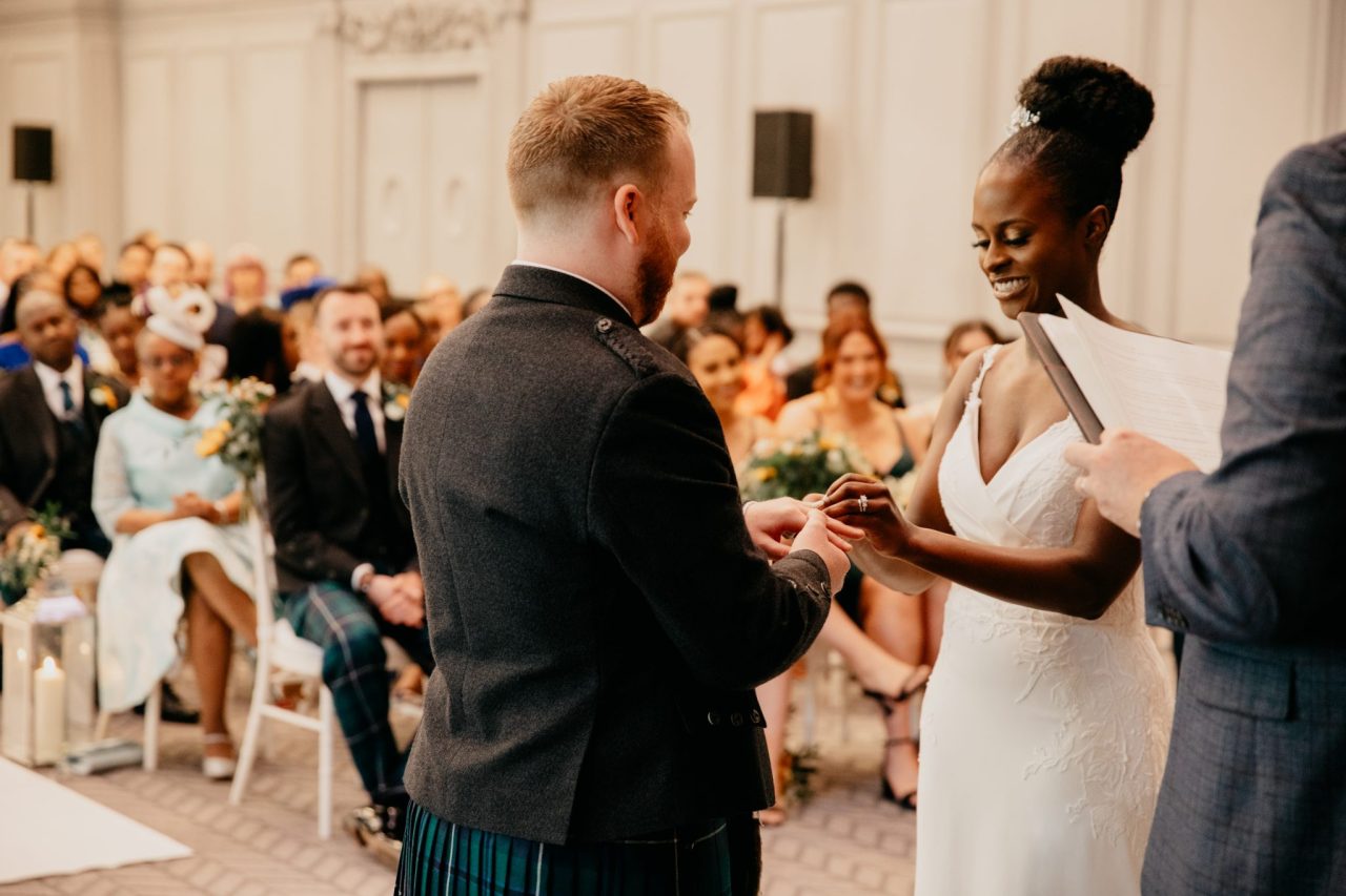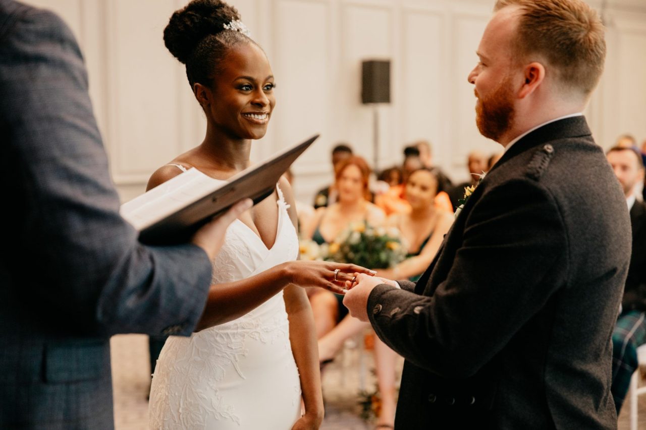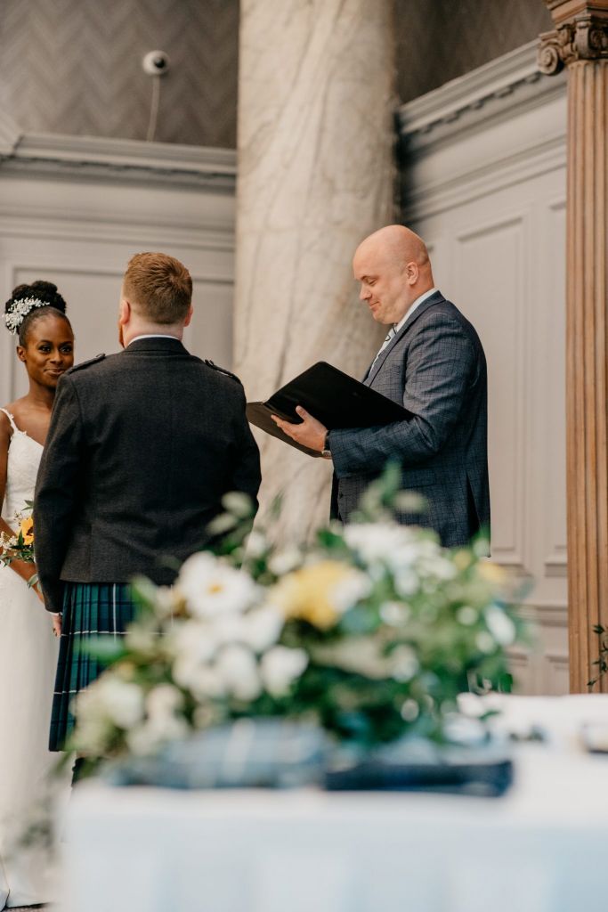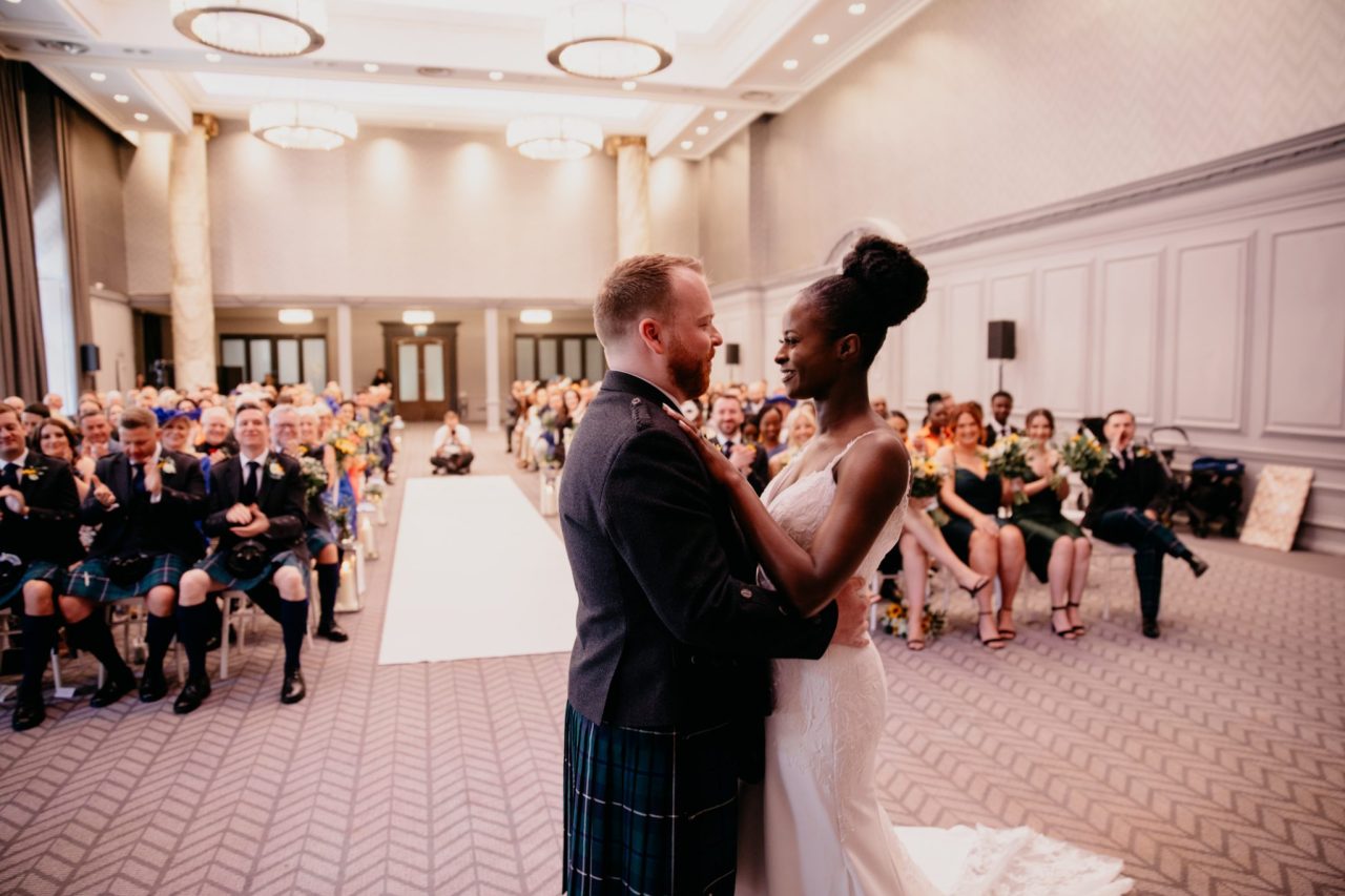 It was my absolutely pleasure to conduct the humanist wedding ceremony of Monique and Chris at the stunning voco Grand Central Hotel in Glasgow on the 4th of June 2022. This Grade-II listed iconic Glasgow landmark is blessed with Georgian architecture and Art Deco interiors that all come together to create the most grand of wedding atmospheres. It has been lovingly restored to its original features that invite an impressive setting. Chris and Monique were immediately drawn to its beauty along with the advantage of being strategically placed at Glasgow Central Station, meaning an easy wedding commute for their near and far travelled guests.