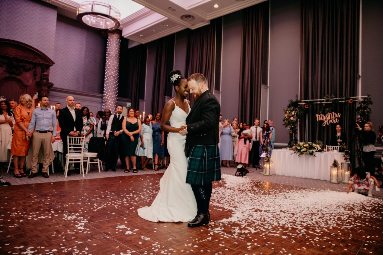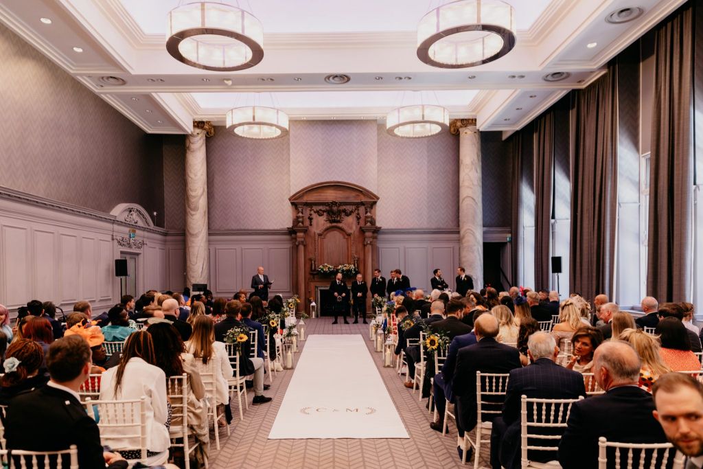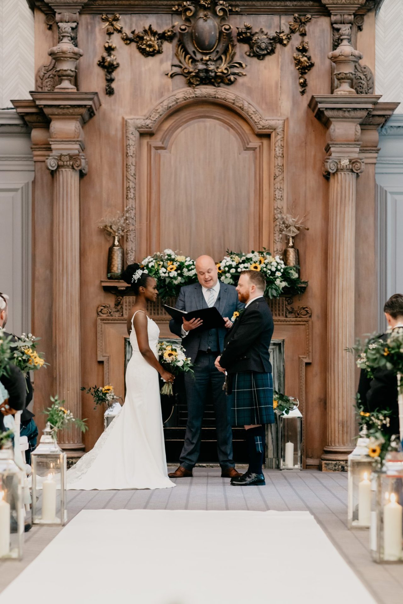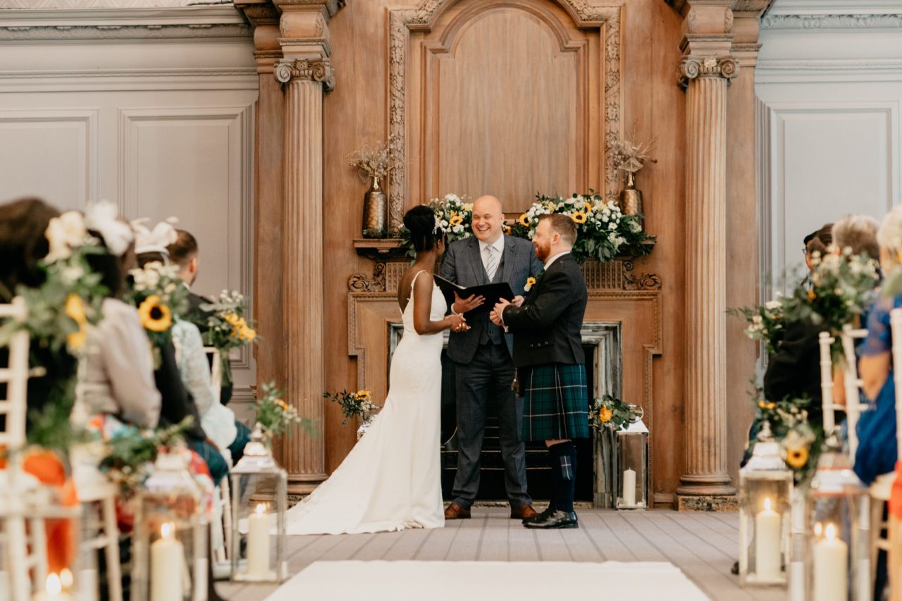 It was my absolutely pleasure to conduct the humanist wedding ceremony of Monique and Chris at the stunning voco Grand Central Hotel in Glasgow on the 4th of June 2022. This Grade-II listed iconic Glasgow landmark is blessed with Georgian architecture and Art Deco interiors that all come together to create the most grand of wedding atmospheres. It has been lovingly restored to its original features that invite an impressive setting. Chris and Monique were immediately drawn to its beauty along with the advantage of being strategically placed at Glasgow Central Station, meaning an easy wedding commute for their near and far travelled guests.
