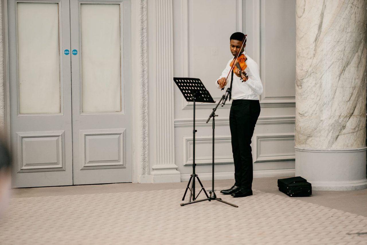 “As Chris and Monique completed their legal paperwork alongside witnesses – Colin, the best man and Monique’s aunt Belinda – Monique’s very talented brother Ryan, entertained everyone with a violin solo while the signing took place.”