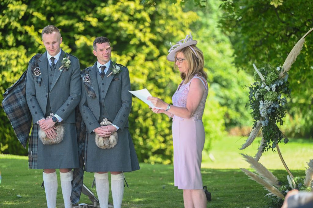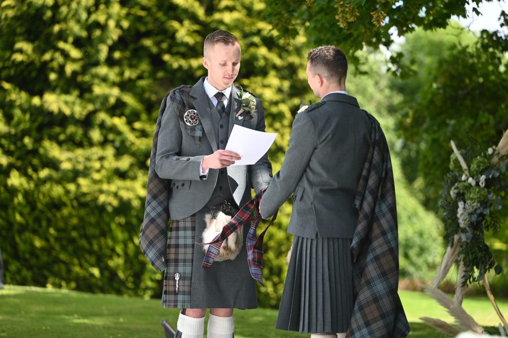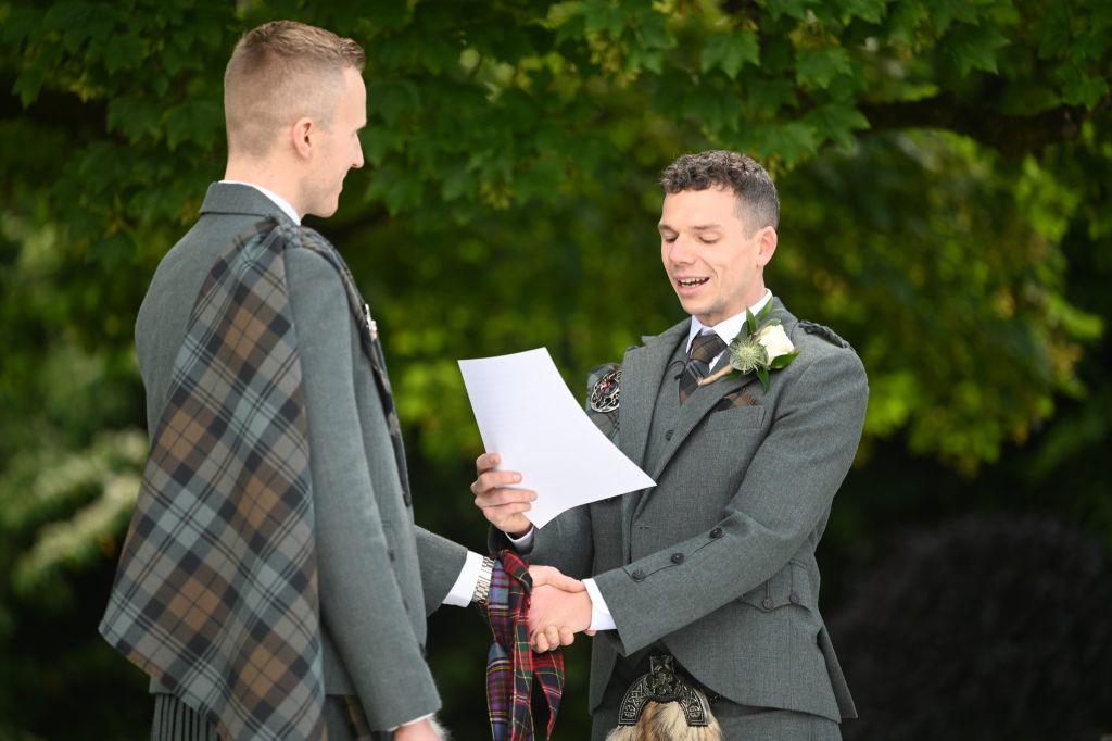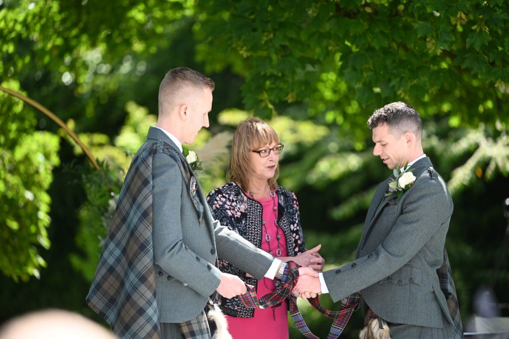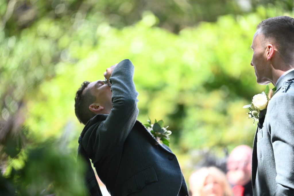 Wedding planning began and the original date was to be during the short window of opportunity that they were both aged 30 but a pandemic changed all their plans – here we are today – Douglas is still 30, but unfortunately Ross has moved on to the ripe old age of 31. It is great to see so many of you have made the journey to be here for them both today on their wedding day – even if it is 357 days later than planned.