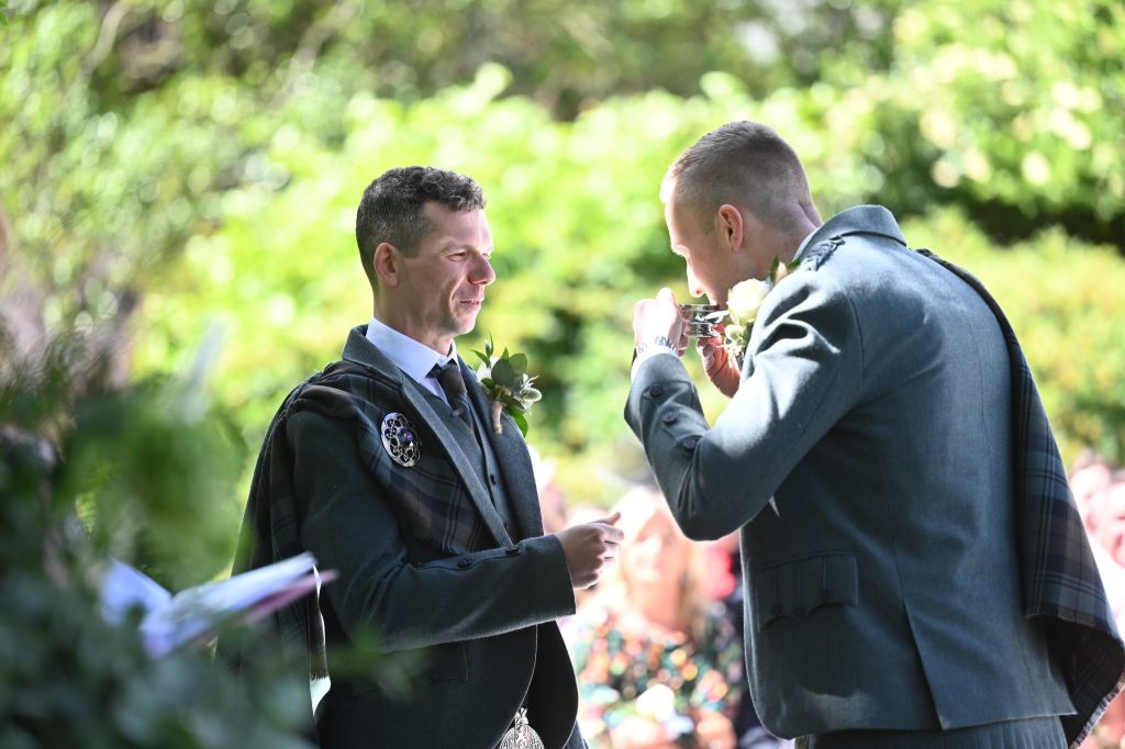 The happy couple share a drink from the Quaich
