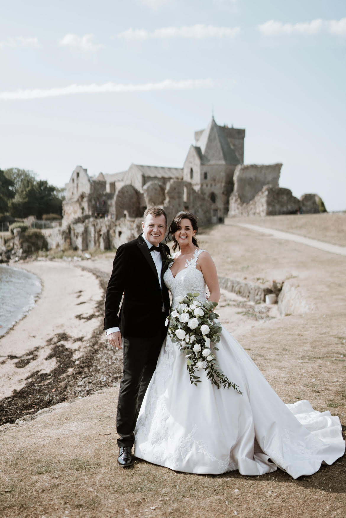Stacey and Brian’s beach walk setting with Inchcolm Abbey as their backdrop