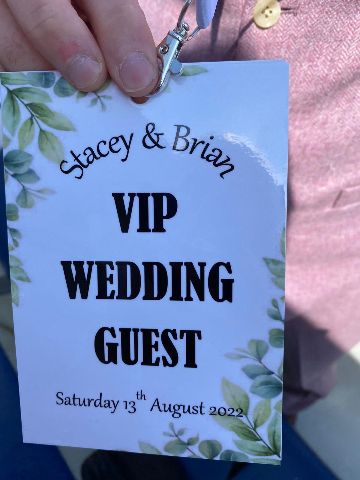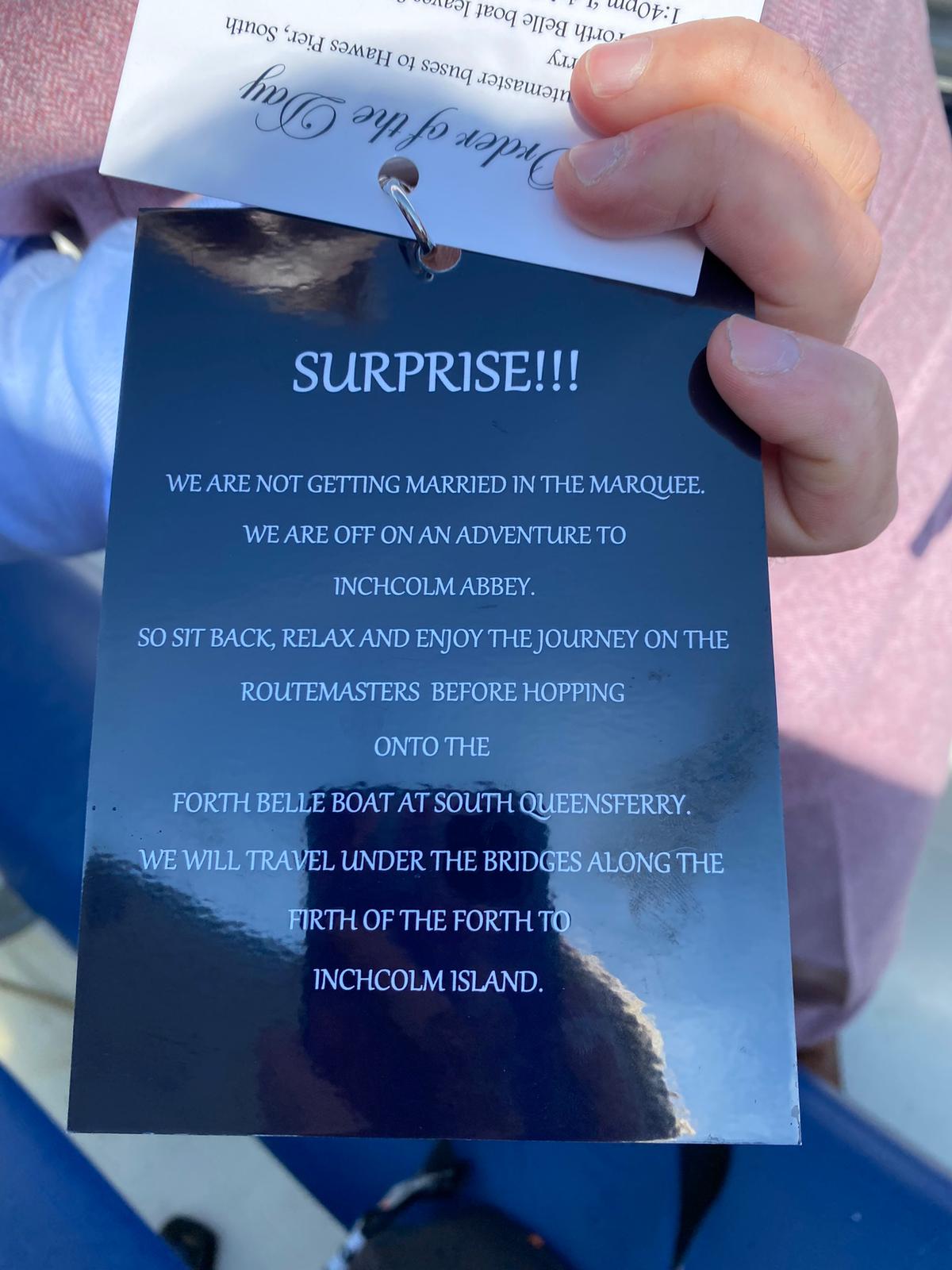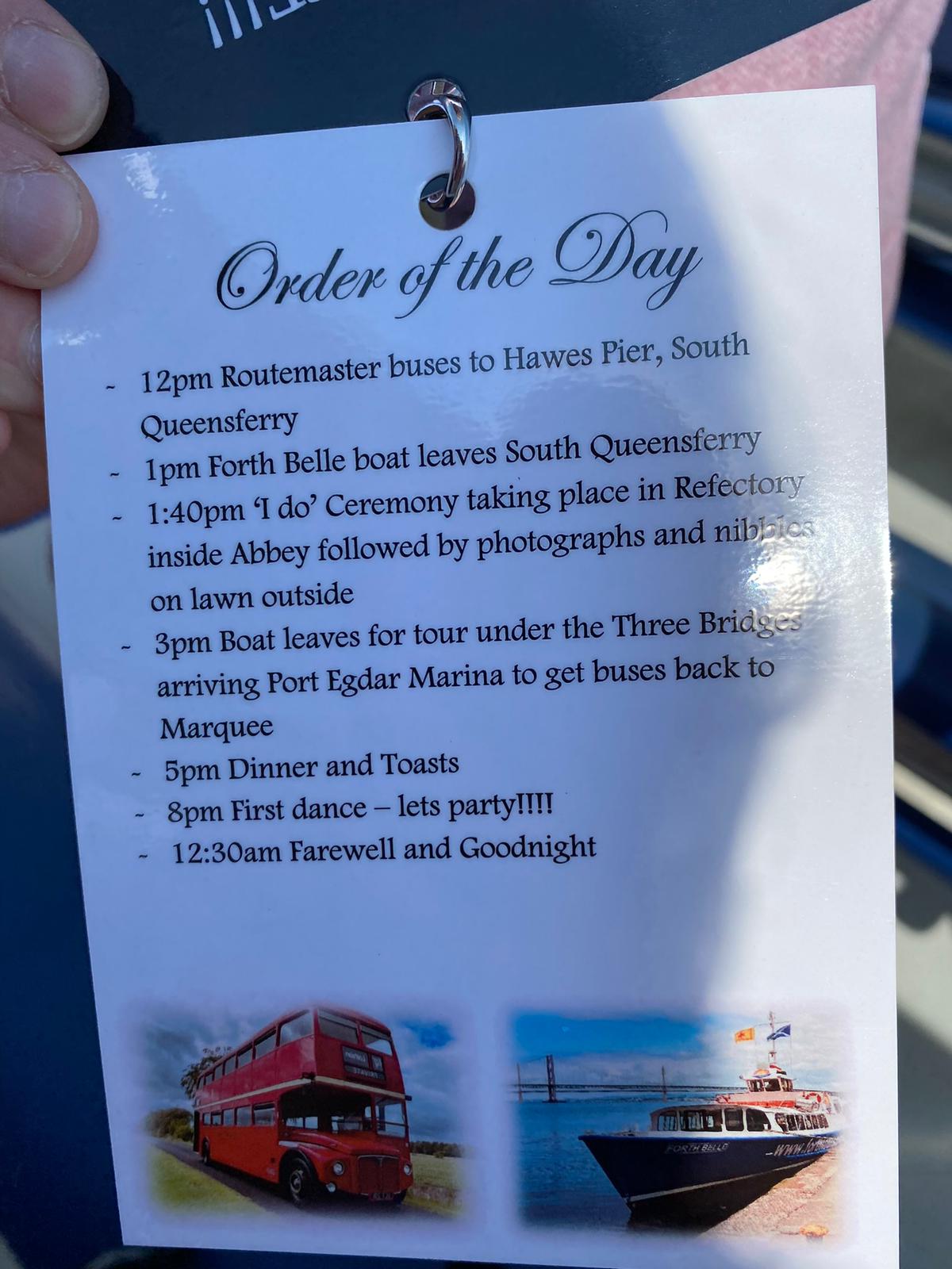 The vintage Edinburgh buses drew up allowing the groom, groomsmen and guests to board. They walked along the pier wearing VIP lanyards detailing the order of the day thus letting them all in on Stacey and Brian’s secret wedding day plans.