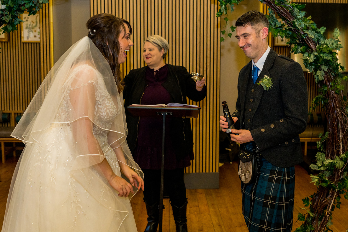 Above: Yvonne Hannah, Fuze Celebrant, helps Sara & Steven celebrate with some Prosecco from their quaich at The Royal Botanic Gardens, Edinburgh – Photo by Cameron Photography