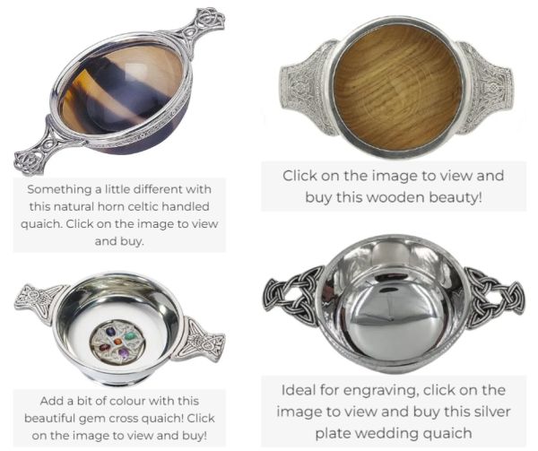 In Scottish tradition, the Quaich also represents the coming together of two families or clans in unity and friendship. When filled with whisky, each person takes turns drinking from the Quaich, symbolising the sharing of life’s joys and sorrows, and the strengthening of bonds between loved ones. Of course it’s not always a wee dram that’s shared as modern couples have been known to fill the quaich with whatever their heart desires. Gin & Tonic, Prosecco, a cocktail, a coke and even plain old water have been used.