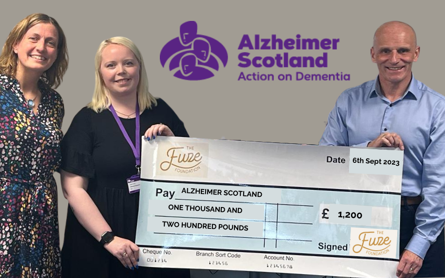 Pictured below: Judith Hughes, Stakeholder Engagement Leader (left) and Lauran Farmer, Stakeholder Engagement Coordinator (right of Judith) from Alzheimer Scotland receive the Fuze Foundation Q2 give back amount of £1,200 – from George McLean, Fuze Brand Ambassador (right)
