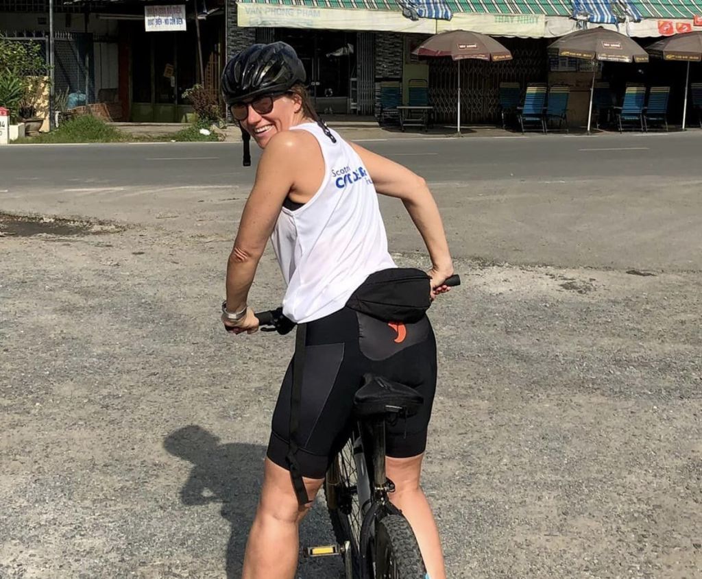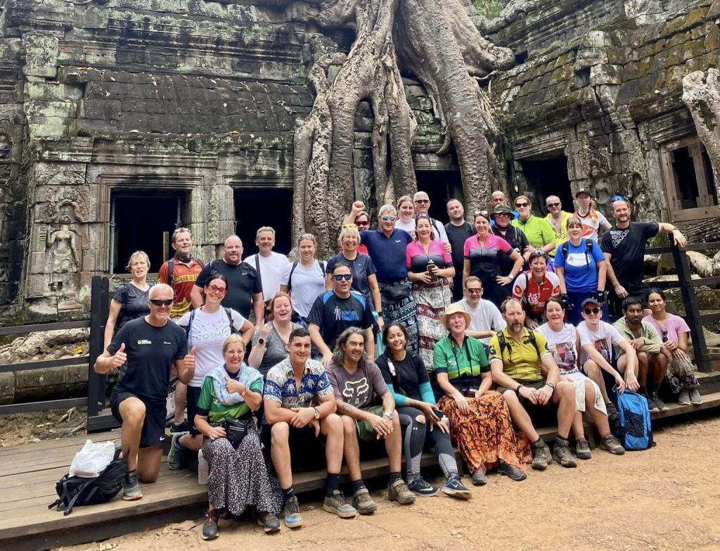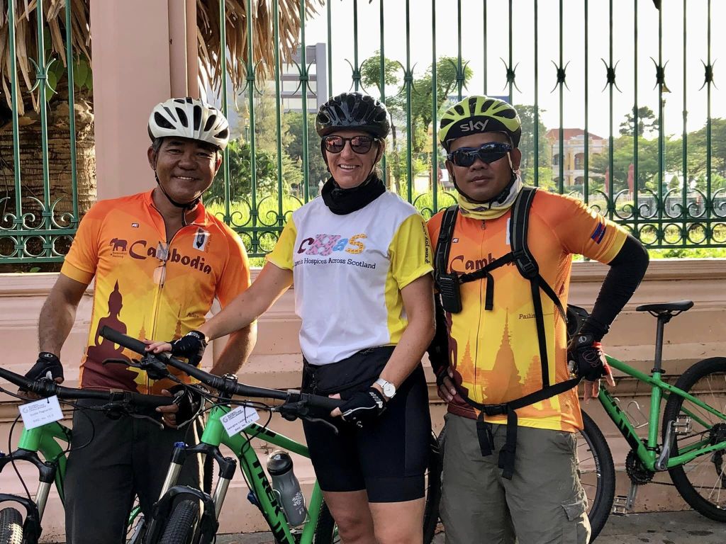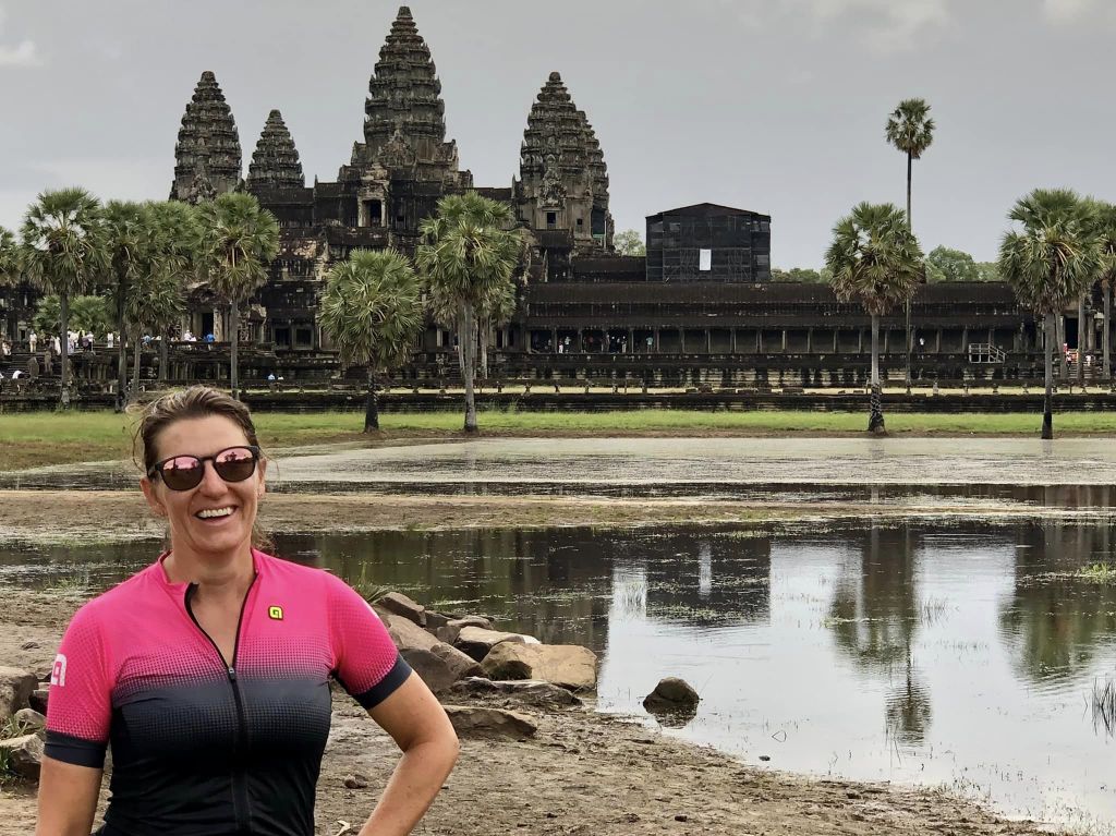Pictured below is Gina at the end point of the ride outside the world famous Angkor Wat Temple in Cambodia