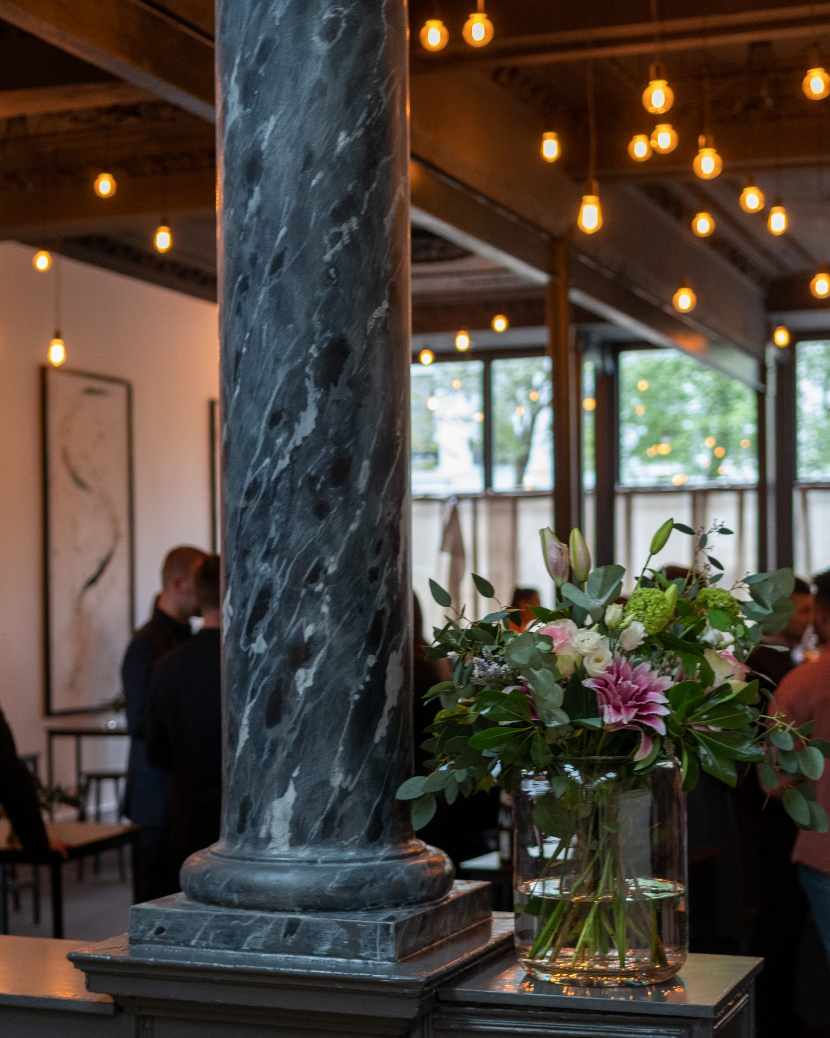 One of the reasons we fell in love with the venue was the exposed brick walls and hardwood flooring. It makes the venue feel very romantic and special while also being a really cool space. We painted the ceiling with traditional cornicing black to create a contrast between traditional and modern and then hung Edison style lightbulbs to amplify this.