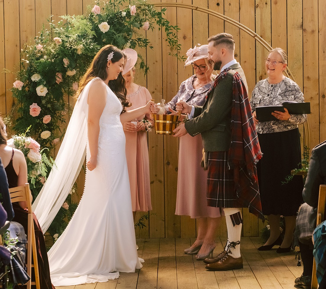 Instead of the traditional whisky punch, Grant and Helen opted for a fine Scottish gin paired with a locally produced tonic – a nod to both tradition and personal taste. Their ceremony took on an extra layer of meaning when their mothers, Shona and Marianne, were invited to come forward and give their blessing.